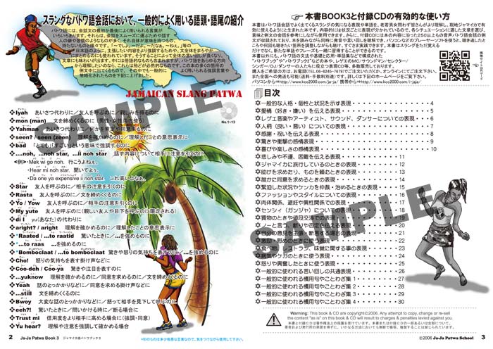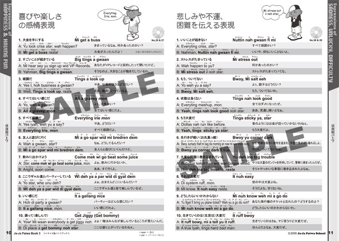 少しパトワ語を話せるレゲエファンやサウンドマンに聞いてみると、「ごく身近なパトワフレーズが意外と言えない」という悩みをよく耳にします。日常パトワのコミュニケーションに欠かせない"そのひと言・フレーズ・表現などがわからない"とか、"親近感のあるスラングパトワをうまく話せない"方が多いようです。本書はスラングなパトワ会話をするための、フレーズや表現・セリフなどを集めました。さらに、スラング会話の例文が250以上も収録されたCDもついています。この付録CDは、ほとんどのCDプレーヤーやパソコン等で試聴可能です。これであなたも、レゲエ音楽が生まれたゲットーのスラングパトワを、よりわかりやすくスムーズに身近に感じることができます。例えば:感情を伝える表現、愛情を表すフレーズ、人柄を表すフレーズ、断りの表現、何かを頼む時の表現、怒りを表すフレーズ、感謝の表現、レゲエ・ファッション・料理についてのフレーズ、また慣用句やことわざ等々。この本とCDは、パトワ語の構造、発音、意味を理解するだけでなく、状況に合わせた様々なフレーズをマスターできます。